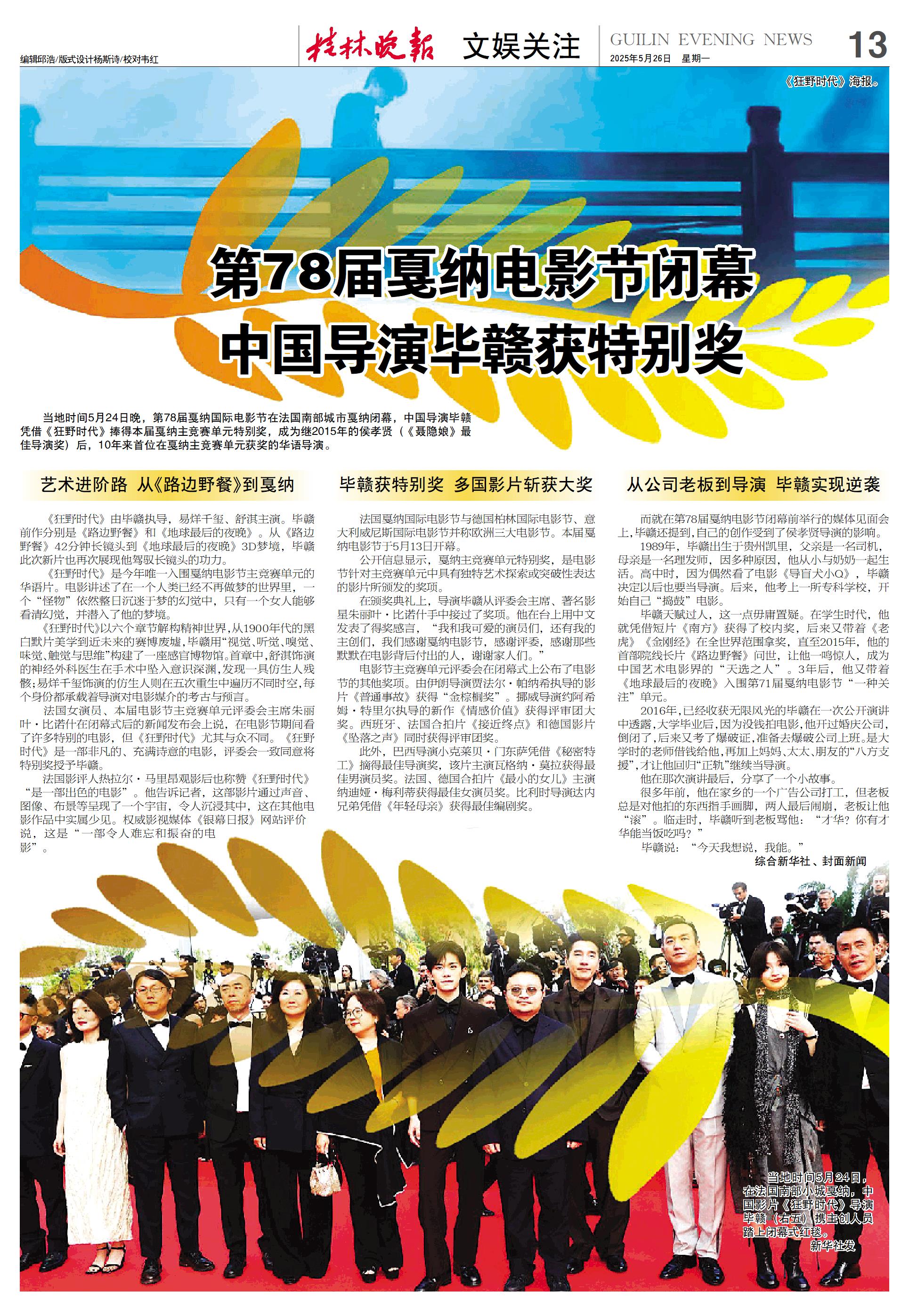当地时间5月24日晚,第78届戛纳国际电影节在法国南部城市戛纳闭幕,中国导演毕赣凭借《狂野时代》捧得本届戛纳主竞赛单元特别奖,成为继2015年的侯孝贤(《聂隐娘》最佳导演奖)后,10年来首位在戛纳主竞赛单元获奖的华语导演。