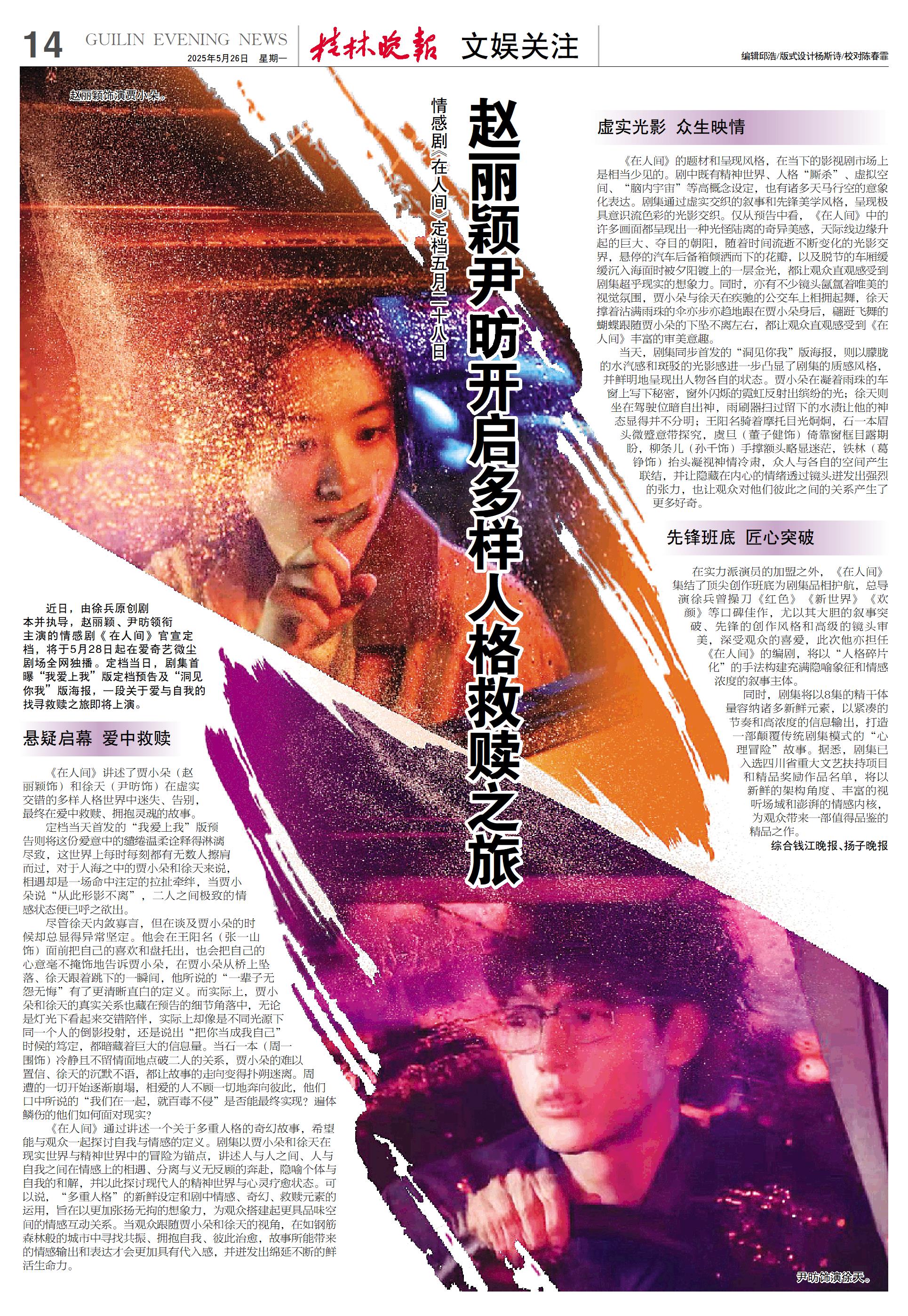 《在人间》讲述了贾小朵(赵丽颖饰)和徐天(尹昉饰)在虚实交错的多样人格世界中迷失、告别,最终在爱中救赎、拥抱灵魂的故事。