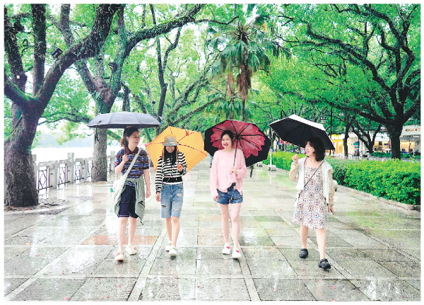 5月28日下午,随着雨势减弱,不少人到滨江路散步,感受清新靓丽的桂林。图为4位来自河北的游客,打着伞走在滨江路有说有笑,享受惬意的旅行。