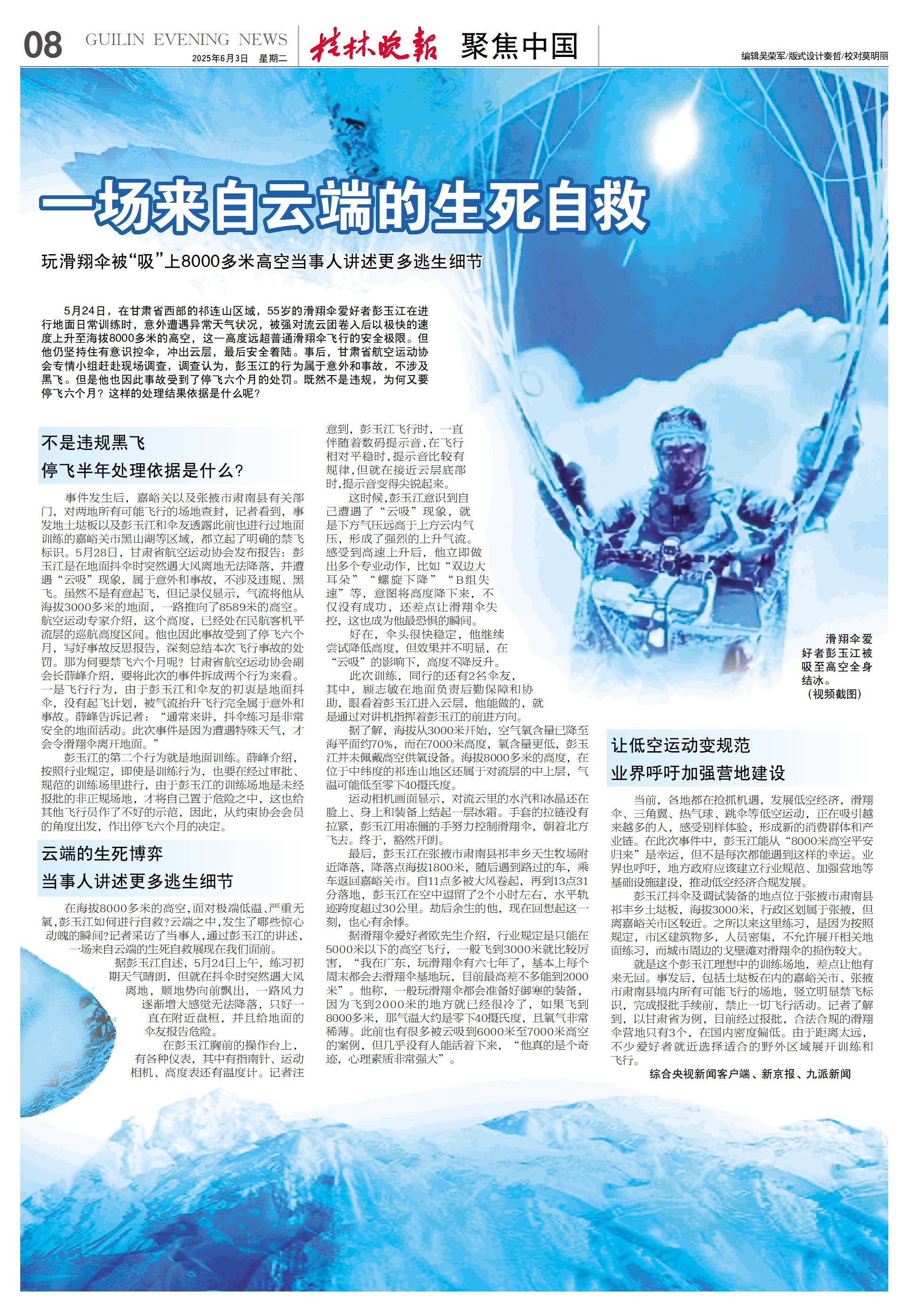 当前,各地都在抢抓机遇,发展低空经济,滑翔伞、三角翼、热气球、跳伞等低空运动,正在吸引越来越多的人,感受别样体验,形成新的消费群体和产业链。在此次事件中,彭玉江能从“8000米高空平安归来”是幸运,但不是每次都能遇到这样的幸运。业界也呼吁,地方政府应该建立行业规范、加强营地等基础设施建设,推动低空经济合规发展。