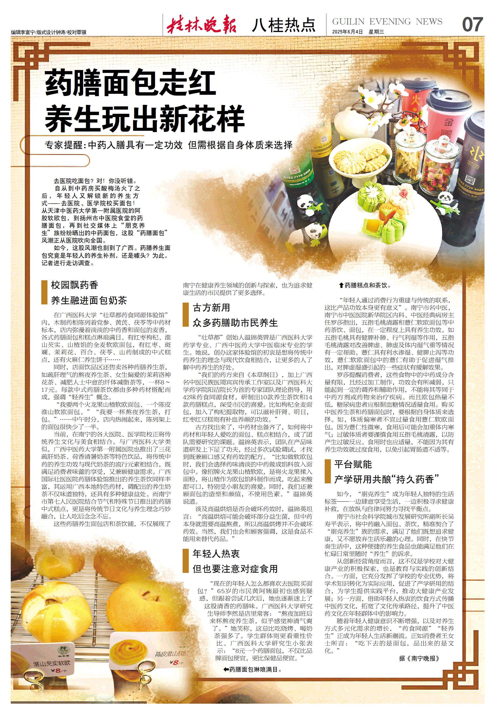 南宁市社会科学院城市发展研究所副所长吴寿平表示,将中药融入面包、茶饮,精准契合了“朋克养生”族的需求,满足了他们既想追求健康,又不愿放弃生活乐趣的心理。同时,在快节奏生活中,这种便捷的养生食品也能满足他们在忙碌日常里随时“养生”的诉求。