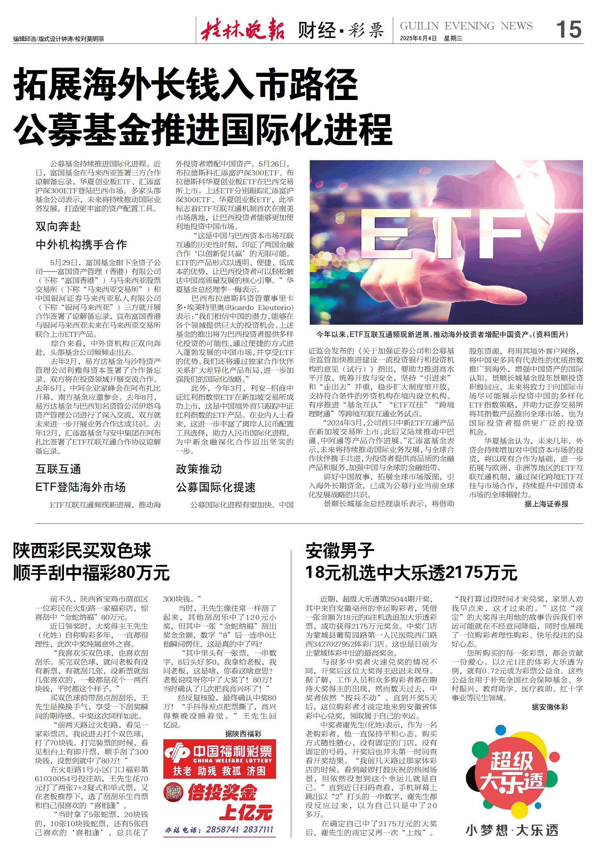 公募基金持续推进国际化进程。近日,富国基金在马来西亚签署三方合作谅解备忘录,华夏创业板ETF、汇添富沪深300ETF登陆巴西市场。多家头部基金公司表示,未来将持续推动国际业务发展,打造更丰富的资产配置工具。