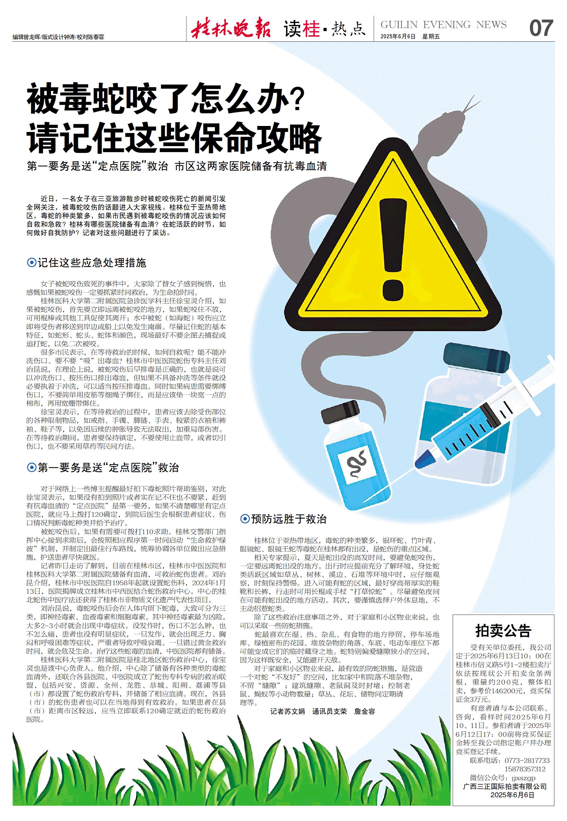 近日,一名女子在三亚旅游散步时被蛇咬伤死亡的新闻引发全网关注,被毒蛇咬伤的话题进入大家视线。桂林位于亚热带地区,毒蛇的种类繁多,如果市民遇到被毒蛇咬伤的情况应该如何自救和急救?桂林有哪些医院储备有血清?在蛇活跃的时节,如何做好自我防护?记者对这些问题进行了采访。