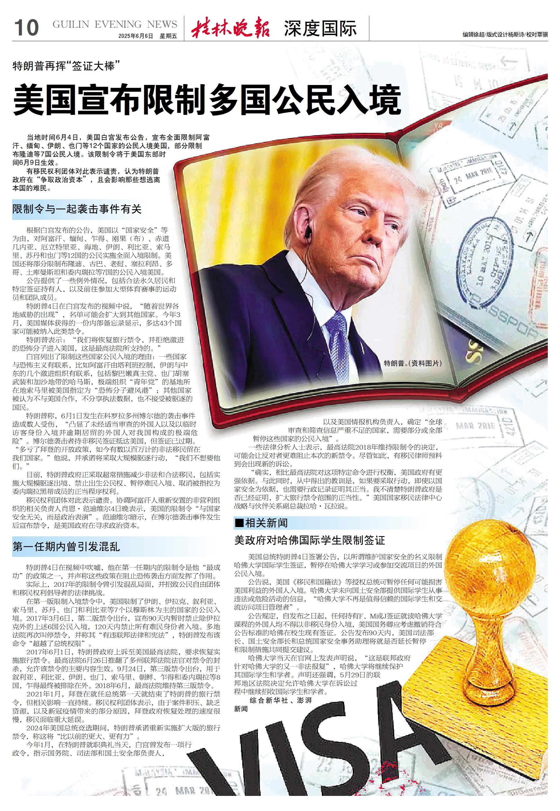 特朗普4日在白宫发布的视频中说,“随着世界各地威胁的出现”,名单可能会扩大到其他国家。今年3月,美国媒体获得的一份内部备忘录显示,多达43个国家可能被纳入此类禁令。