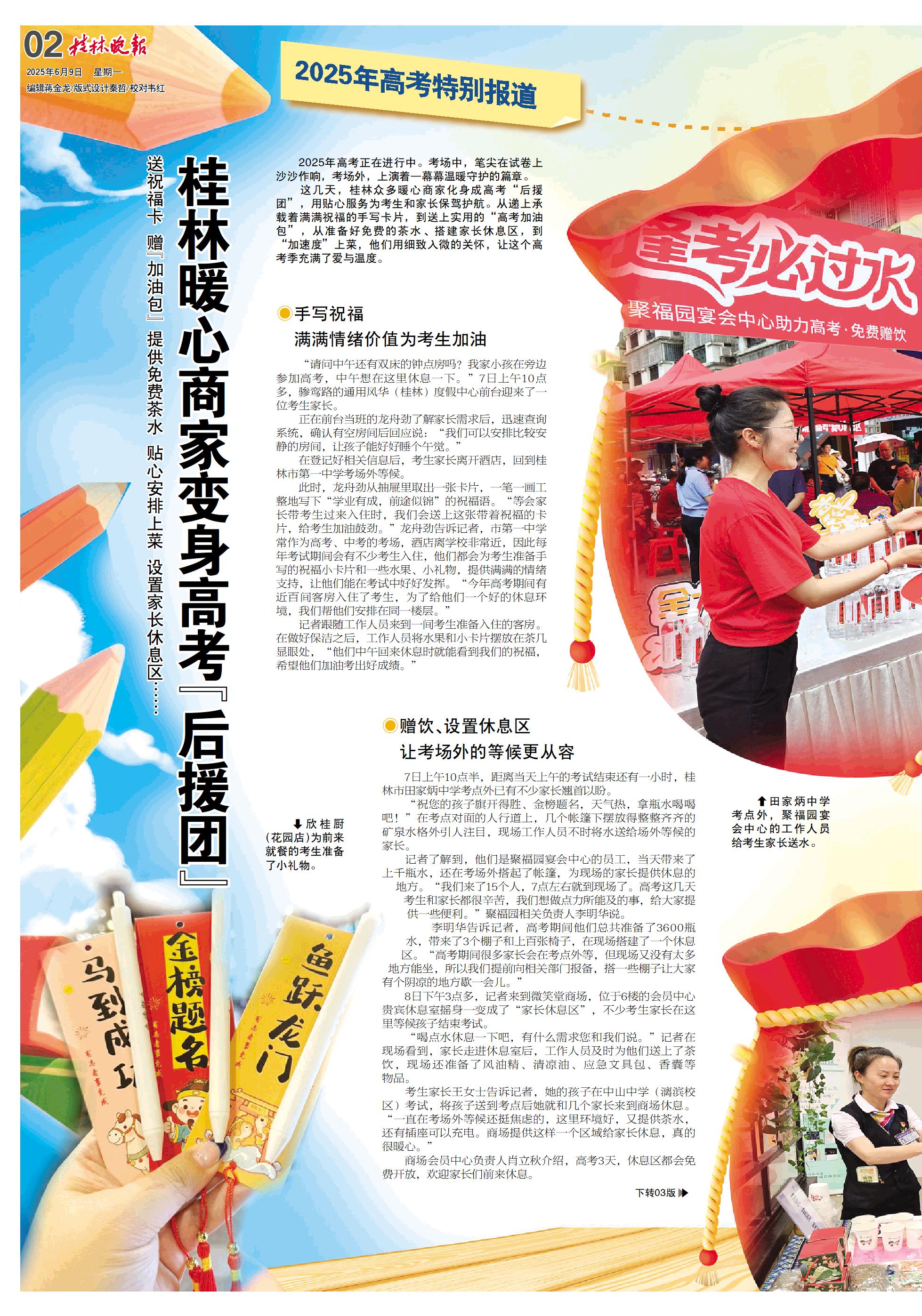 这几天,桂林众多暖心商家化身成高考“后援团”,用贴心服务为考生和家长保驾护航。从递上承载着满满祝福的手写卡片,到送上实用的“高考加油包”,从准备好免费的茶水、搭建家长休息区,到“加速度”上菜,他们用细致入微的关怀,让这个高考季充满了爱与温度。