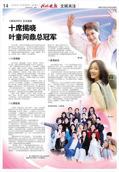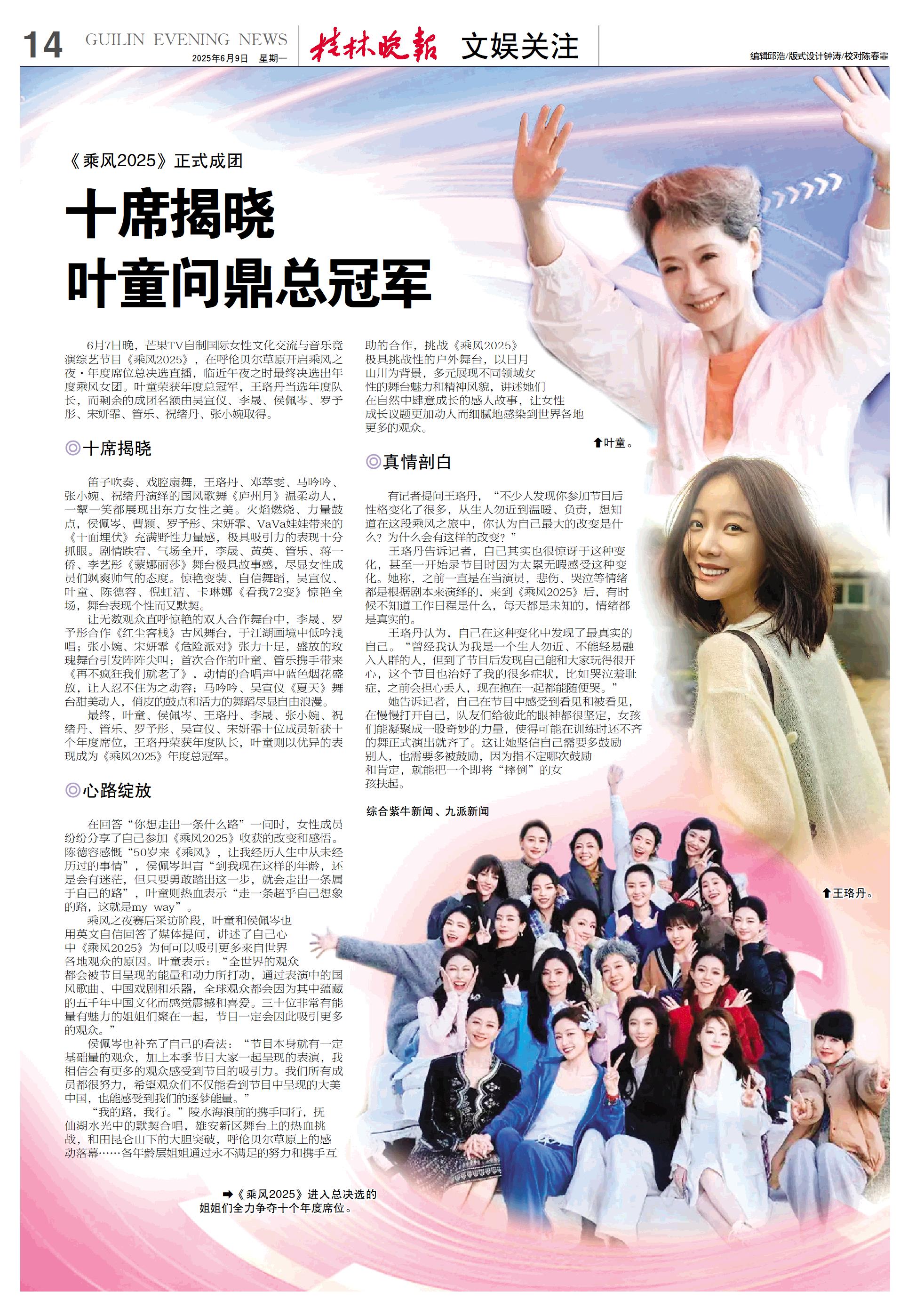 6月7日晚,芒果TV自制国际女性文化交流与音乐竞演综艺节目《乘风2025》,在呼伦贝尔草原开启乘风之夜·年度席位总决选直播,临近午夜之时最终决选出年度乘风女团。叶童荣获年度总冠军,王珞丹当选年度队长,而剩余的成团名额由吴宣仪、李晟、侯佩岑、罗予彤、宋妍霏、管乐、祝绪丹、张小婉取得。