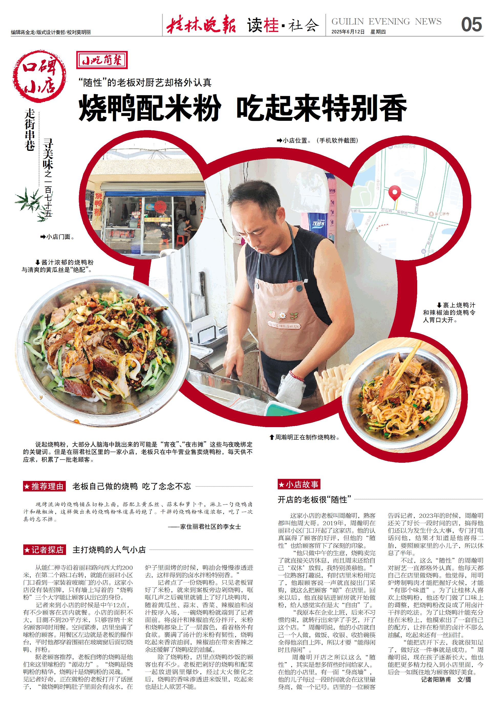 不过,这么“随性”的周瀚明对厨艺一直都格外认真。他每天都自己在店里做烧鸭。他觉得,用明炉烤制鸭肉才能把握好火候,才能“有那个味道”。为了让桂林人喜欢上烧鸭粉,他还专门做了口味上的调整,把烧鸭粉改良成了用卤汁干拌的吃法。为了让烧鸭汁能充分挂在米粉上,他摸索出了一套自己的配方,让拌在粉里的卤汁不那么油腻,吃起来还有一丝回甘。