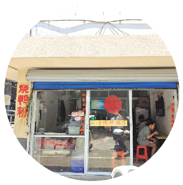 从能仁禅寺沿着丽君路向西大约200米,在第二个路口右转,就能在丽君小区门口看到一家装着玻璃门的小店。这家小店没有装招牌,只有墙上写着的“烧鸭粉”三个大字能让顾客认出它的身份。