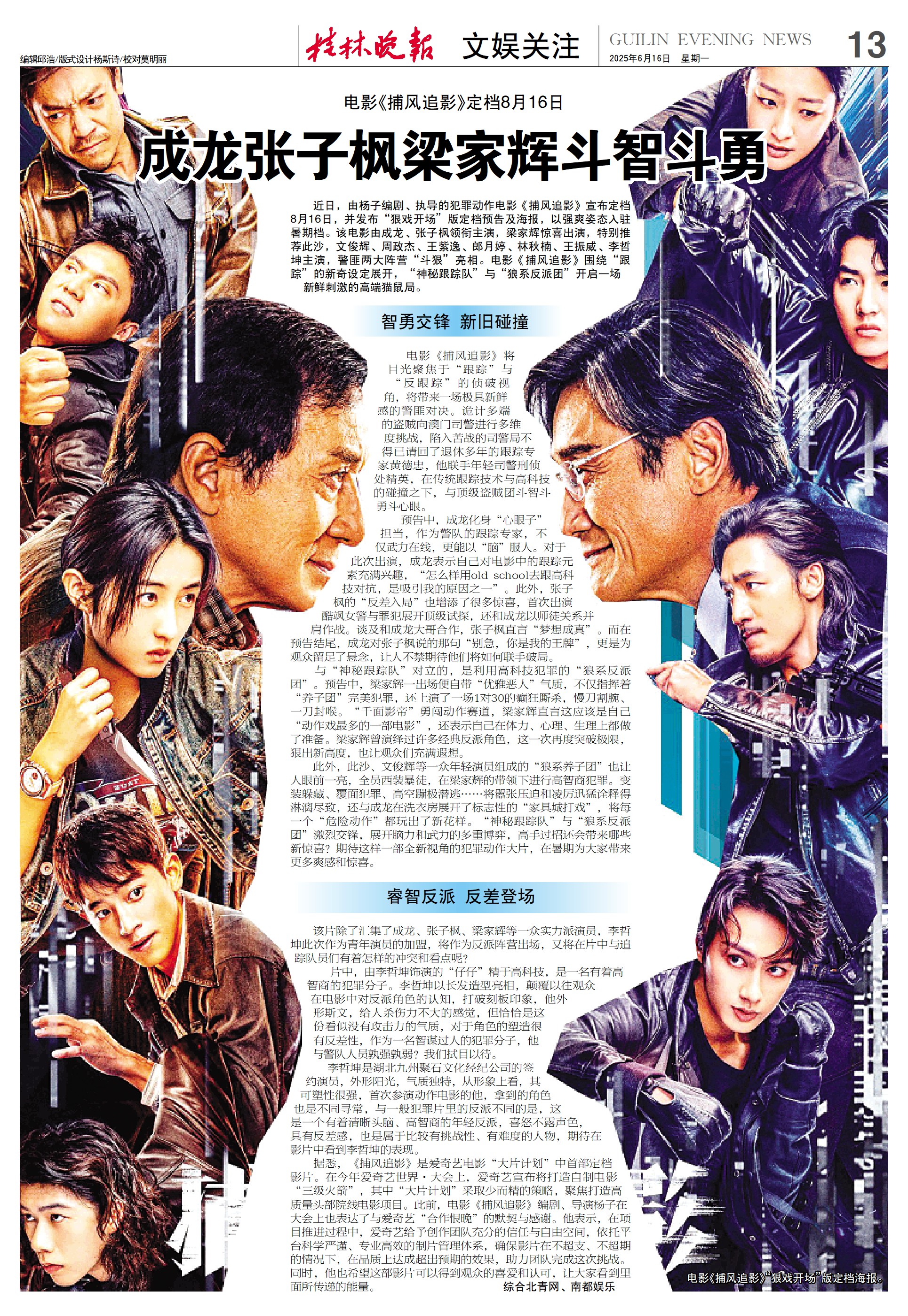 近日,由杨子编剧、执导的犯罪动作电影《捕风追影》宣布定档8月16日,并发布“狠戏开场”版定档预告及海报,以强爽姿态入驻暑期档。该电影由成龙、张子枫领衔主演,梁家辉惊喜出演,特别推荐此沙,文俊辉、周政杰、王紫逸、郎月婷、林秋楠、王振威、李哲坤主演,警匪两大阵营“斗狠”亮相。电影《捕风追影》围绕“跟踪”的新奇设定展开,“神秘跟踪队”与“狼系反派团”开启一场新鲜刺激的高端猫鼠局。