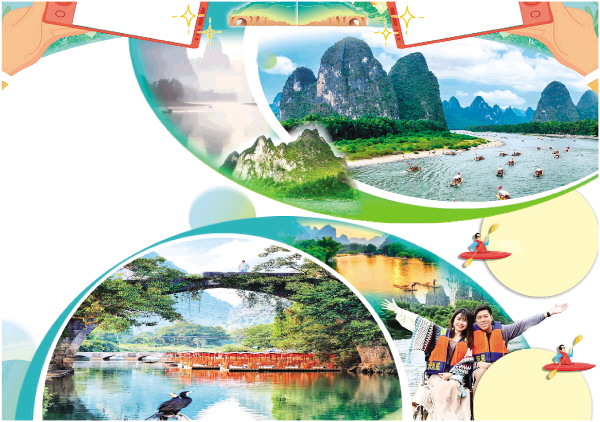 休闲漂 舟行碧波青山伴 人游画中时光慢
