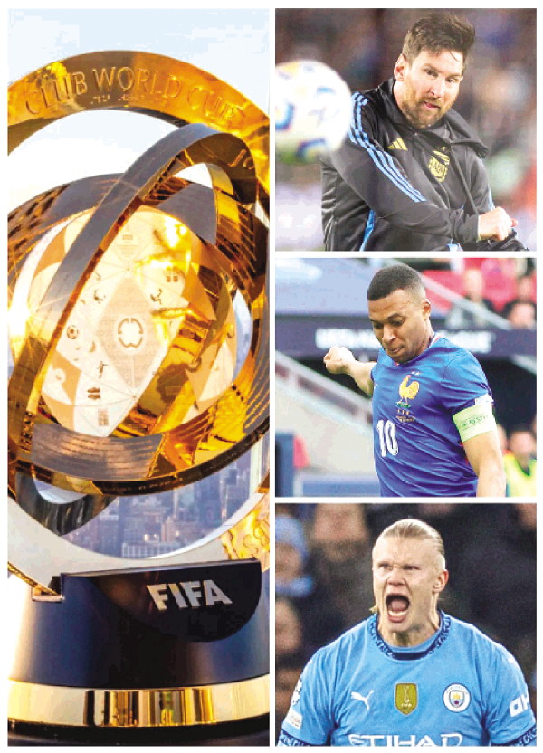 本届世俱杯,梅西(右上)、姆巴佩(右中)、哈兰德(右下)等世界球星将同台竞技。