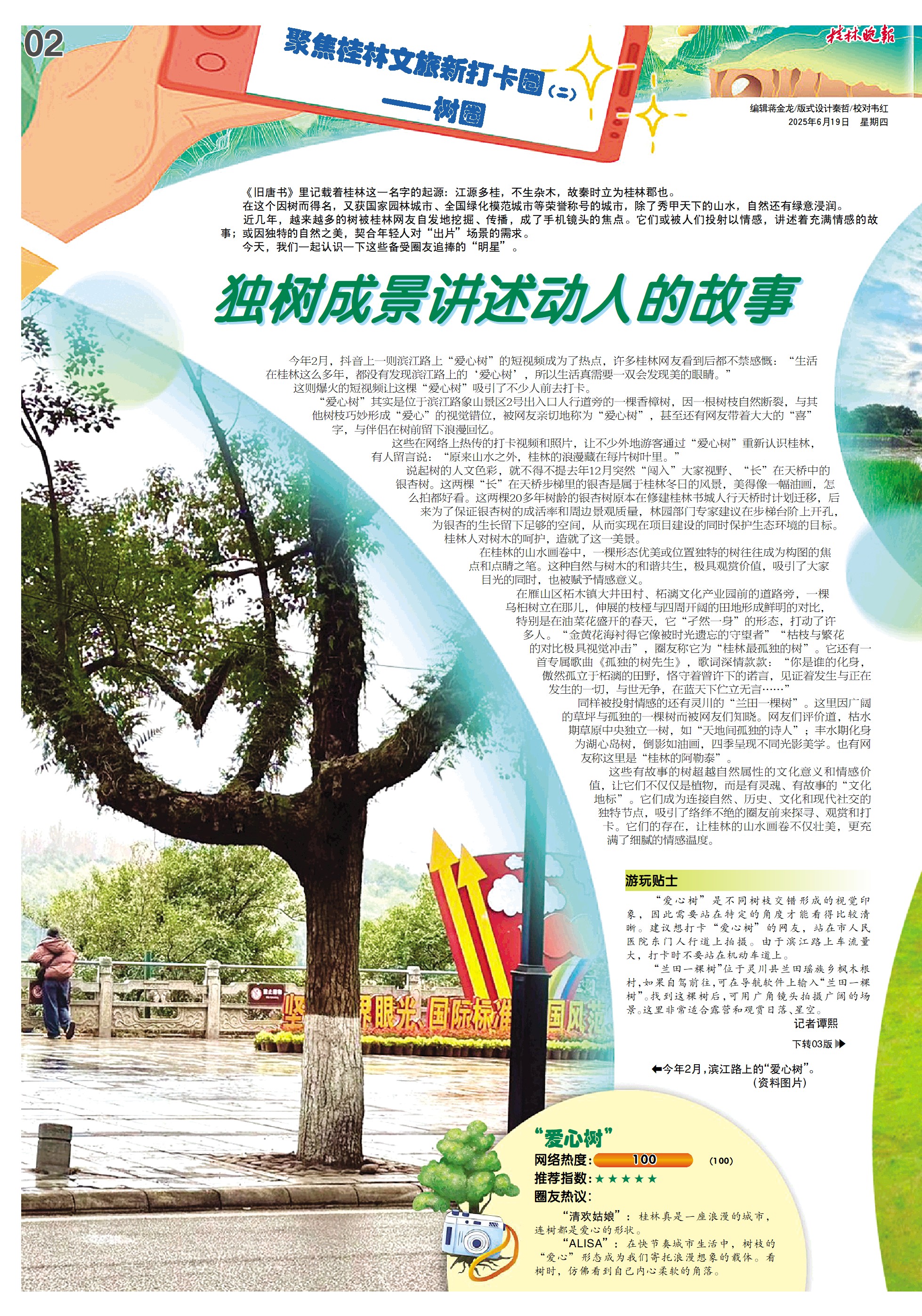 这些在网络上热传的打卡视频和照片,让不少外地游客通过“爱心树”重新认识桂林,有人留言说:“原来山水之外,桂林的浪漫藏在每片树叶里。”