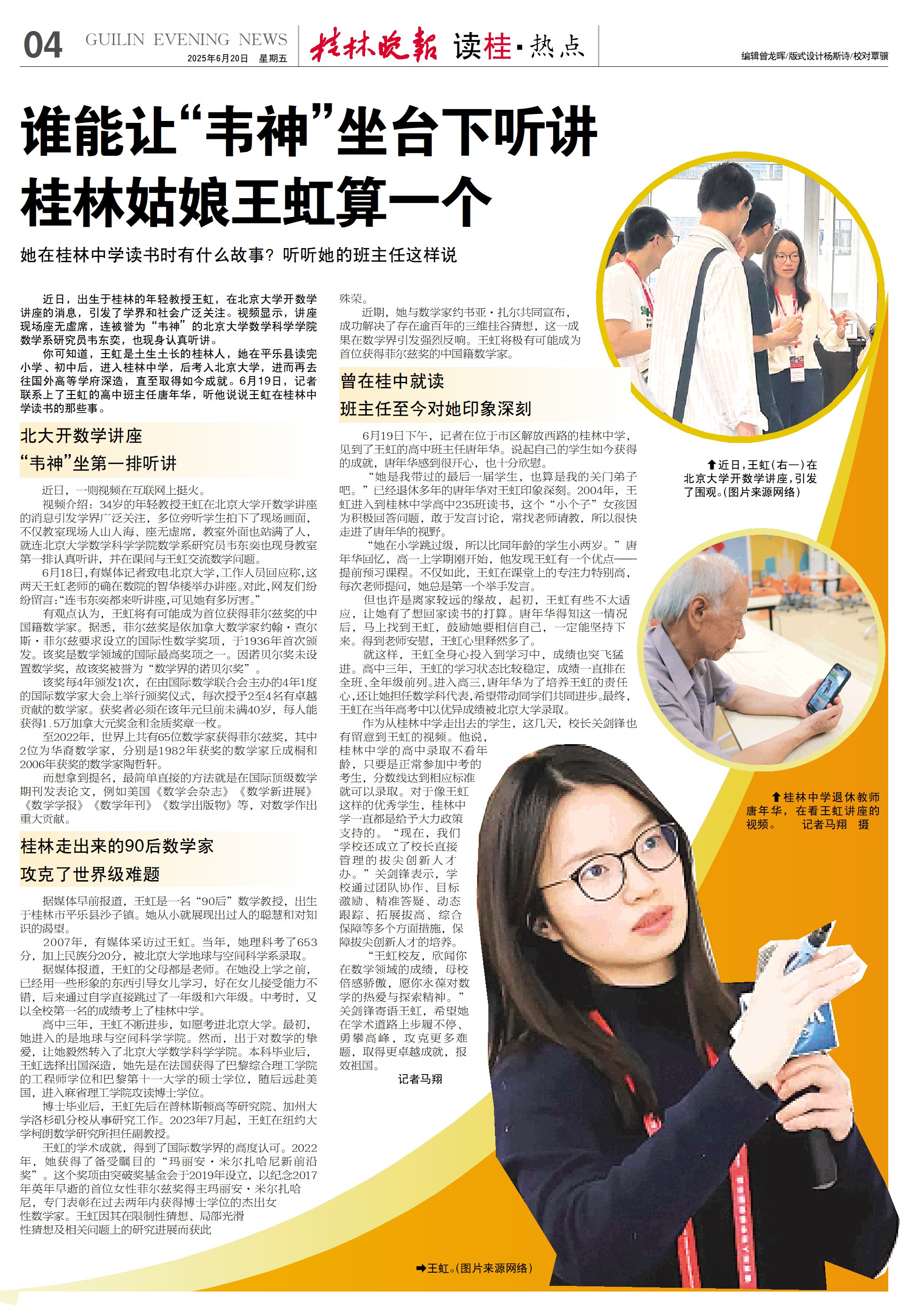 近日,出生于桂林的年轻教授王虹,在北京大学开数学讲座的消息,引发了学界和社会广泛关注。视频显示,讲座现场座无虚席,连被誉为“韦神”的北京大学数学科学学院数学系研究员韦东奕,也现身认真听讲。