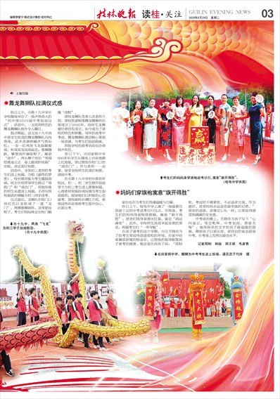 昨日上午,桂电中学上演了一场温馨且创意十足的中考送考壮行仪式。在现场,考生们的妈妈身着精致旗袍,寓意“旗开得胜”;爸爸们则身着喜庆红装,象征“鸿运满堂”。此外,学校师生高高举起金黄的葵花,祝福考生们“一举夺魁”。