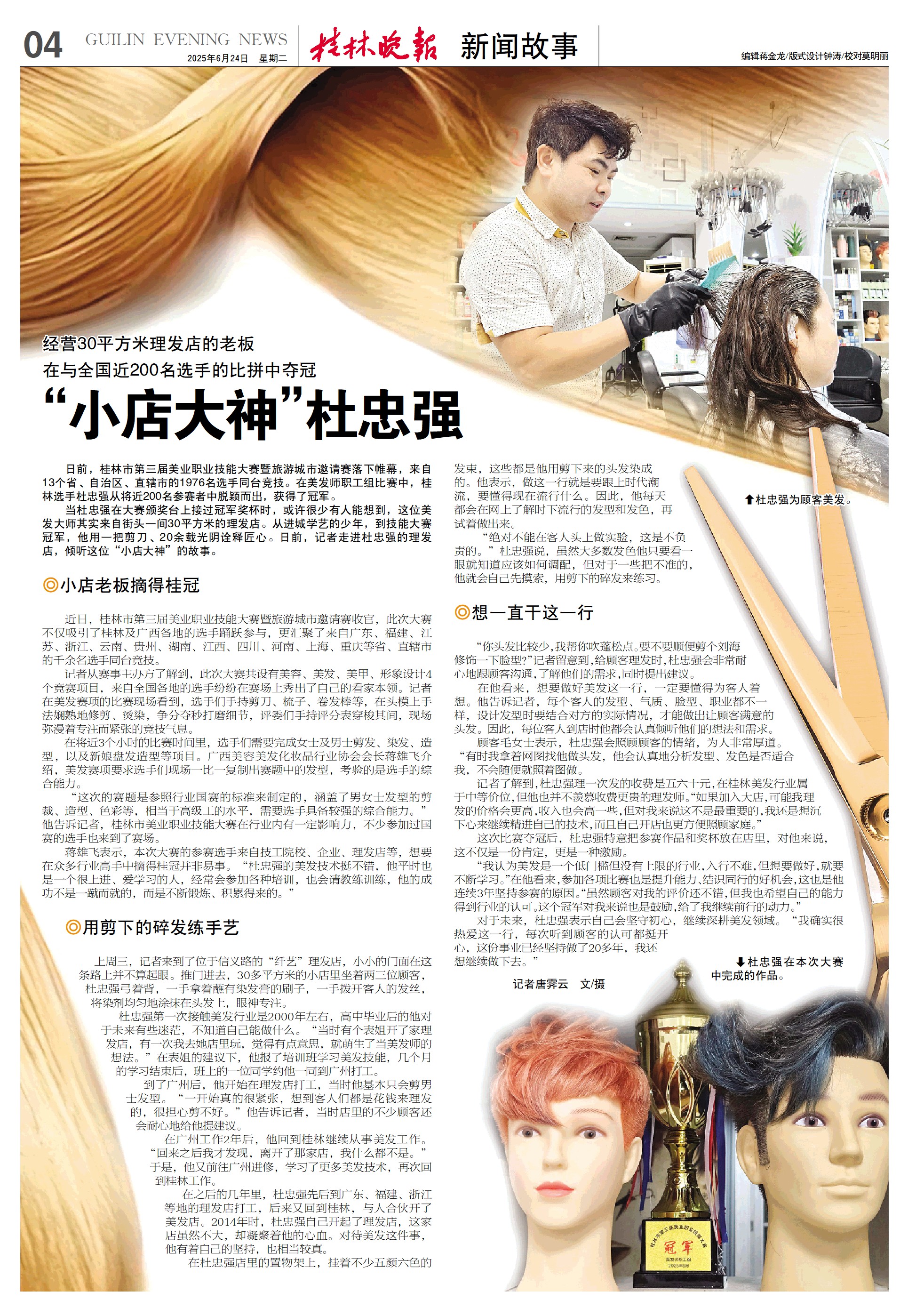 当杜忠强在大赛颁奖台上接过冠军奖杯时,或许很少有人能想到,这位美发大师其实来自街头一间30平方米的理发店。从进城学艺的少年,到技能大赛冠军,他用一把剪刀、20余载光阴诠释匠心。日前,记者走进杜忠强的理发店,倾听这位“小店大神”的故事。