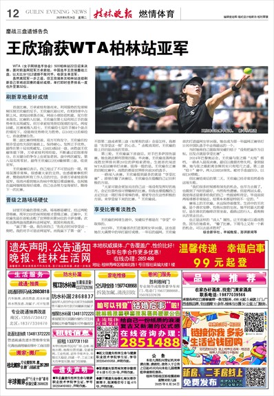 WTA(女子网球选手协会)500柏林站22日迎来决赛。面对前温网冠军万卓索娃,中国选手王欣瑜鏖战三盘,以大比分1比2遗憾不敌对手,收获女单亚军。