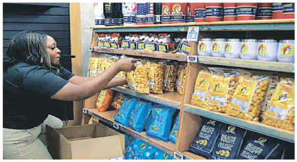 美国一超市的工作人员在摆放货物。