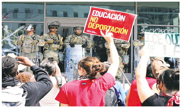 6月9日,在美国加利福尼亚州洛杉矶一处联邦机构建筑外,示威者与国民警卫队人员对峙,抗议特朗普政府大肆抓捕非法移民和调遣国民警卫队进驻洛杉矶地区。 据新华社