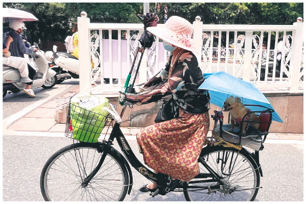 近日正午,阳光炽热,一位市民骑自行车经过信义桥,后座车筐里坐着一只小狗,为了防晒,市民贴心地为小狗撑了一把伞,为其带来一丝清凉。