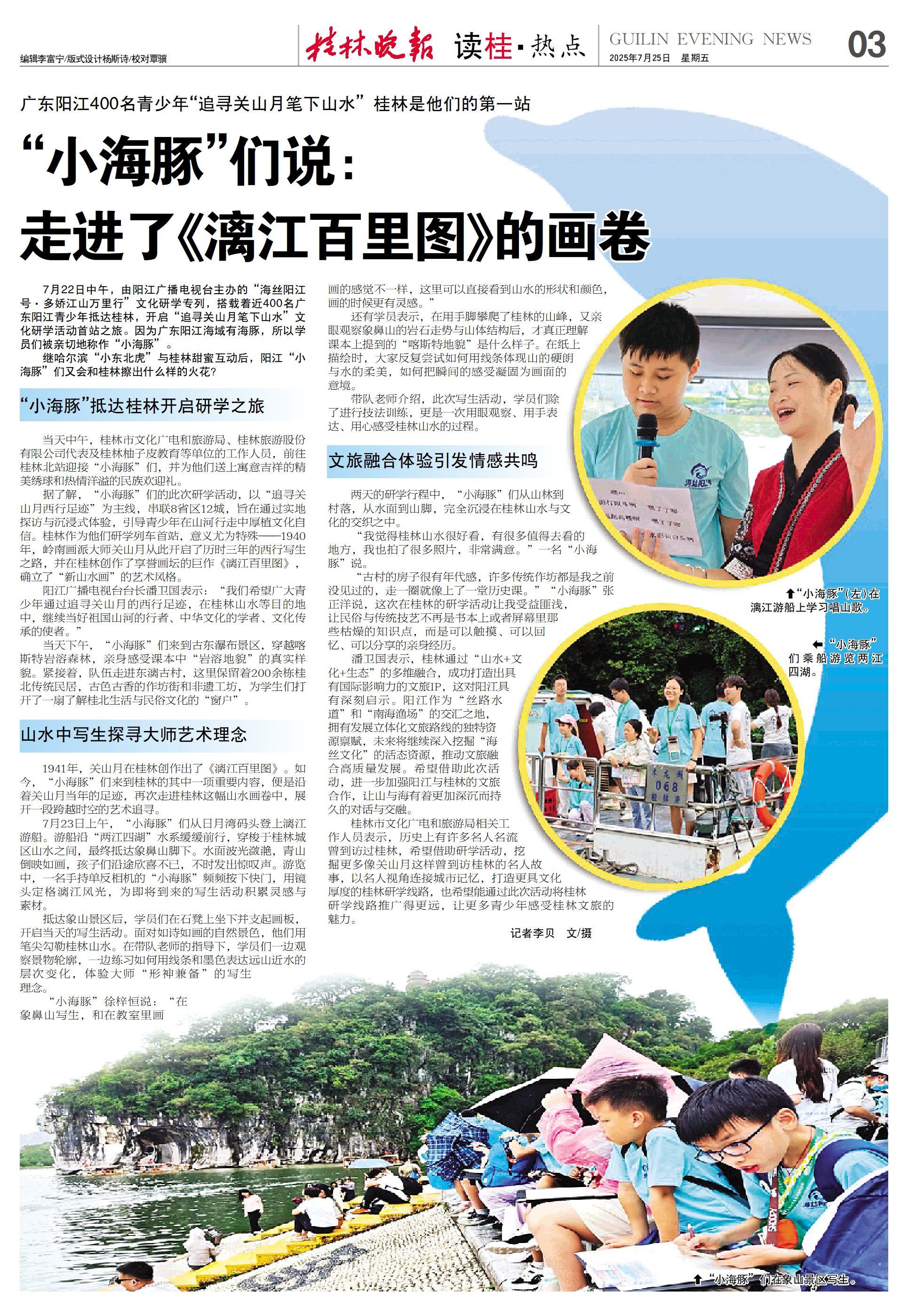 1941年,关山月在桂林创作出了《漓江百里图》。如今,“小海豚”们来到桂林的其中一项重要内容,便是沿着关山月当年的足迹,再次走进桂林这幅山水画卷中,展开一段跨越时空的艺术追寻。