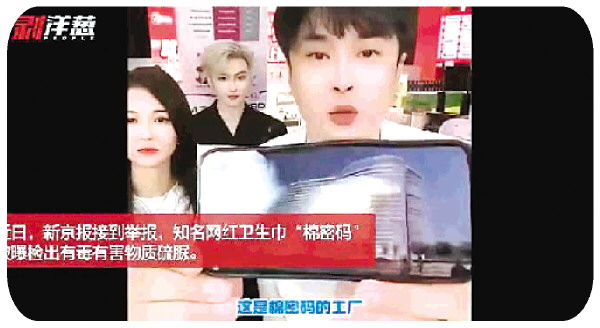 新京报《剥洋葱》节目报道“棉密码”卫生巾被曝检出致癌物的视频截图。
