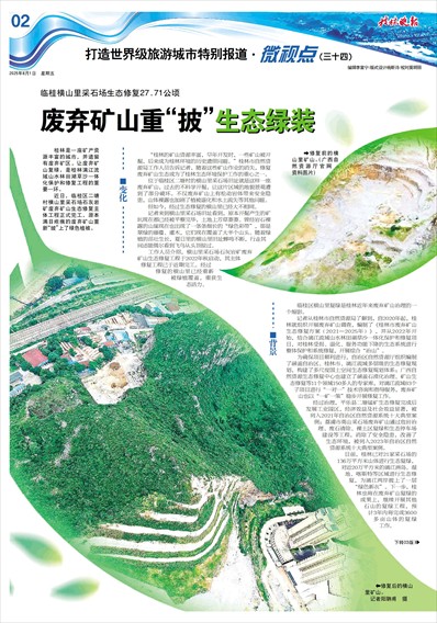 桂林是一座矿产资源丰富的城市,并遗留有废弃矿区。让废弃矿山复绿,是桂林漓江流域山水林田湖草沙一体化保护和修复工程的重要一环。