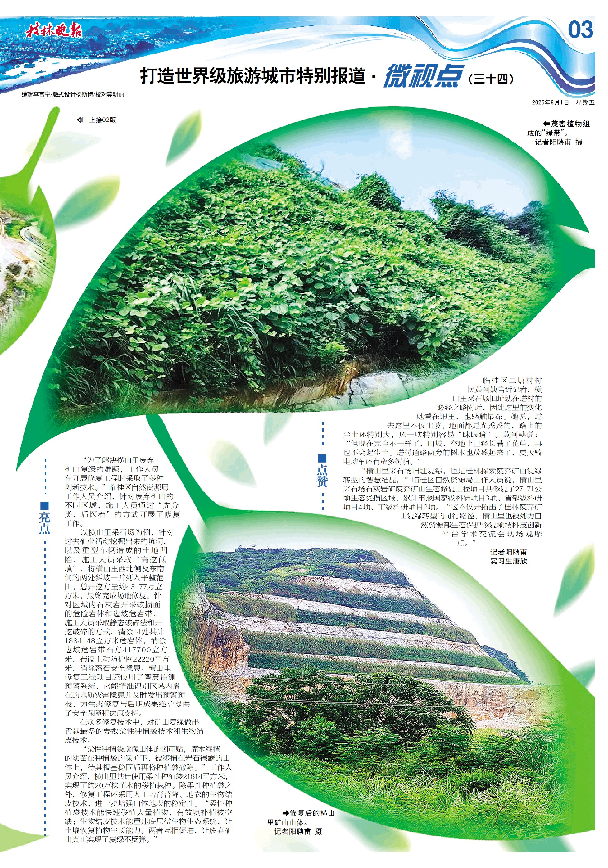 “为了解决横山里废弃矿山复绿的难题,工作人员在开展修复工程时采取了多种创新技术。”临桂区自然资源局工作人员介绍,针对废弃矿山的不同区域,施工人员通过“先分类,后医治”的方式开展了修复工作。