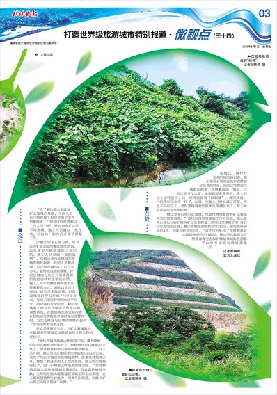 “柔性种植袋就像山体的创可贴,灌木绿植的幼苗在种植袋的保护下,被移植在岩石裸露的山体上,待其根基稳固后再将种植袋撤除。”工作人员介绍,横山里共计使用柔性种植袋21814平方米,实现了约20万株苗木的移植栽种。除柔性种植袋之外,修复工程还采用人工培育苔藓、地衣的生物结皮技术,进一步增强山体地表的稳定性。“柔性种植袋技术能快速移植大量植物,有效填补植被空缺;生物结皮技术能重建底层微生物生态系统,让土壤恢复植物生长能力。两者互相促进,让废弃矿山真正实现了复绿不反弹。”