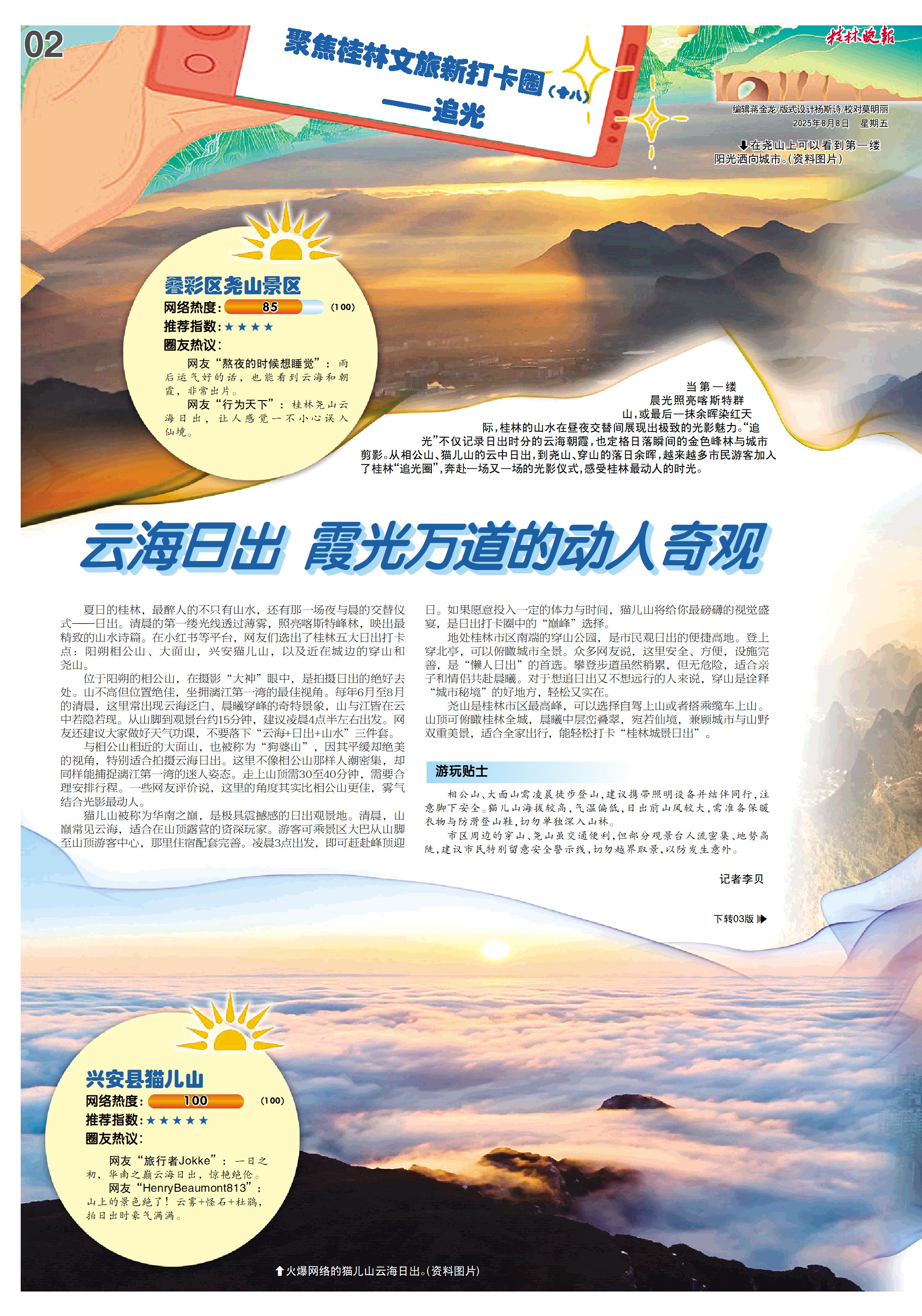 当第一缕晨光照亮喀斯特群山,或最后一抹余晖染红天际,桂林的山水在昼夜交替间展现出极致的光影魅力。“追光”不仅记录日出时分的云海朝霞,也定格日落瞬间的金色峰林与城市剪影。从相公山、猫儿山的云中日出,到尧山、穿山的落日余晖,越来越多市民游客加入了桂林“追光圈”,奔赴一场又一场的光影仪式,感受桂林最动人的时光。