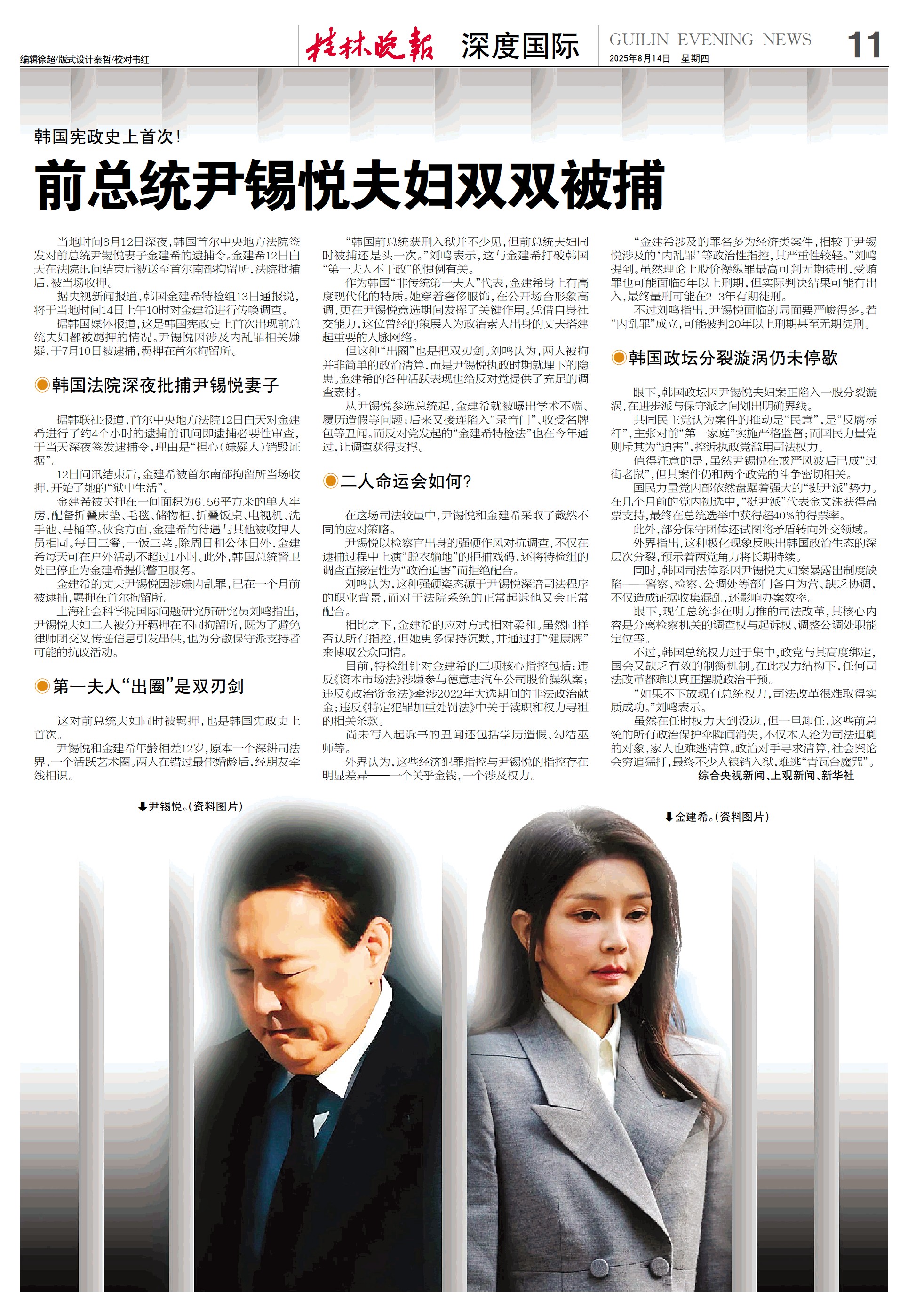 据韩国媒体报道,这是韩国宪政史上首次出现前总统夫妇都被羁押的情况。尹锡悦因涉及内乱罪相关嫌疑,于7月10日被逮捕,羁押在首尔拘留所。