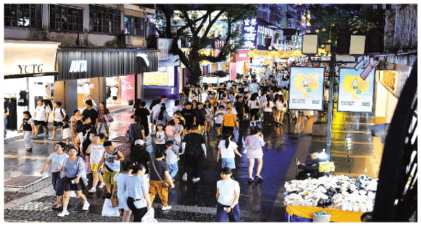 8月11日入夜,正阳步行街人头攒动,众多市民、游客沉浸在桂林夏夜那如火般热烈而又浪漫的氛围之中,感受着这座城市独有的温度与风情。 记者邢刚 摄