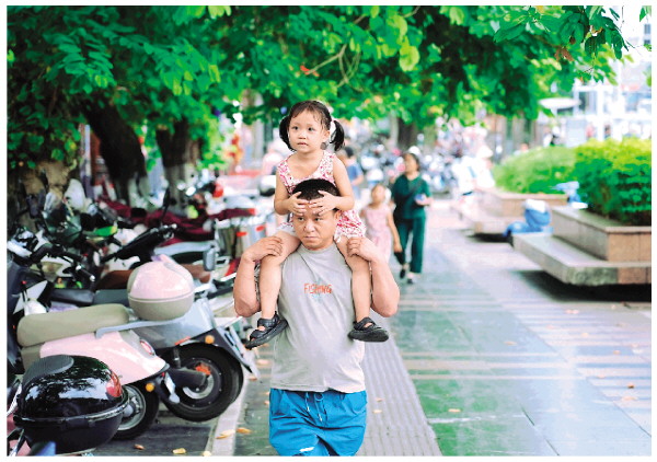 8月14日下午,在中山中路阳桥公交站附近,一个小朋友骑在爸爸的肩膀上看向远方,爸爸则细心地抓住女儿膝盖保证安全。 记者邢刚 摄