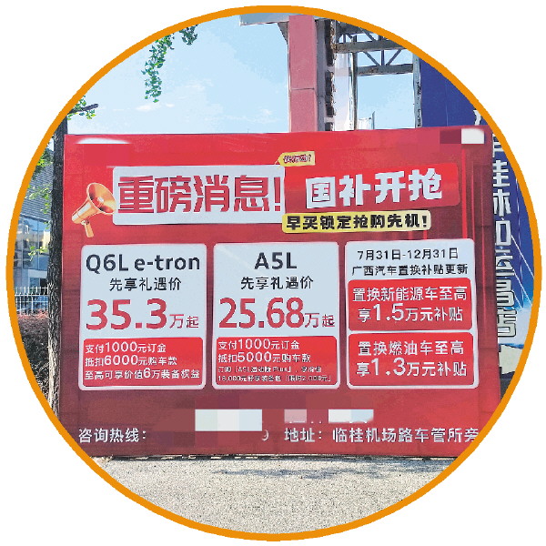 记者还了解到,除了广西汽车置换更新补贴外,国家“汽车报废更新补贴”、厂家汽车置换补贴等活动也在持续中,有商家打出了“购车补贴最高达4万元”的宣传标语。