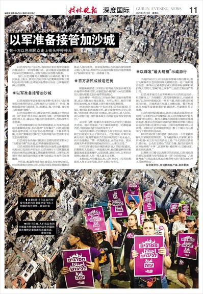 《以色列时报》报道说,此次示威活动是2023年10月7日本轮巴以冲突爆发以来,以色列爆发的“最大规模”停火游行。数万人聚集在国防部大楼附近及周边街道,要求以色列政府立即与巴勒斯坦伊斯兰抵抗运动(哈马斯)达成停火协议,让加沙地带被扣押人员获释。另据以社会团体组织统计,数十个城市当天都举行了类似的抗议活动。