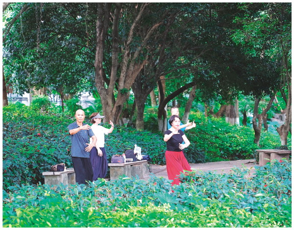 眼下虽已立秋,但天气仍然炎热,不少市民避开中午高温时段,来到河边、湖畔以及公园锻炼身体。图为几位市民近日在西清湖畔的树荫下锻炼。