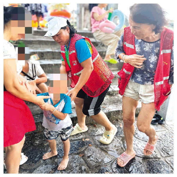 “巡逻时,我看到3个小孩在平台上戏水,最大的七八岁,最小的只有三四岁,3人中只有一人拿着救生设备。我赶紧上前询问,得知他们的家长就在阶梯处,我随即提醒他们要注意安全。”何军燕说。
