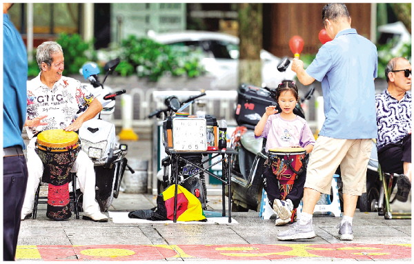 18日早上,在滨江路,一个小朋友有节奏地打鼓,和一旁的“老鼓手”默契配合,开心表演。