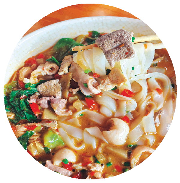 记者点了一碗酸辣煮粉,刚出锅的煮粉香气扑鼻,用筷子把配菜拌匀,每一根米粉都裹满了酸辣汤汁,送进嘴里让人直呼过瘾。切成小段的猪大肠颇有嚼劲,没有异味;猪粉肠则像配角,只在咀嚼的时候才露出一股鲜甜的滋味;切成薄片的瘦肉口感软嫩;吸饱了酸辣汤汁的猪肝口感绵密,是这碗煮粉的点睛之笔。最后,酸辣爽口的酸笋和清新脆嫩的莴笋叶中和了汤汁的“重口味”,既化解了猪杂的厚重油腻,又给煮粉增添了不少爽脆的口感,让所有食材的鲜味在口腔里发生奇妙的连锁反应,吃到最后忍不住连酸辣汤也喝到几乎见底。