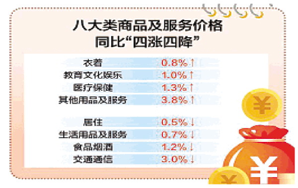 大家关心的居民消费价格方面,1至7月,全区居民消费价格(CPI)同比下降0.5%。从类别看,八大类商品及服务价格同比呈“四涨四降”。其中,衣着、教育文化娱乐、医疗保健、其他用品及服务价格分别上涨0.8%、1.0%、1.3%、3.8%,居住、生活用品及服务、食品烟酒、交通通信价格分别下降0.5%、0.7%、1.2%、3.0%。扣除食品和能源价格后的核心CPI同比上涨0.2%,涨幅比1~6月扩大0.1个百分点。