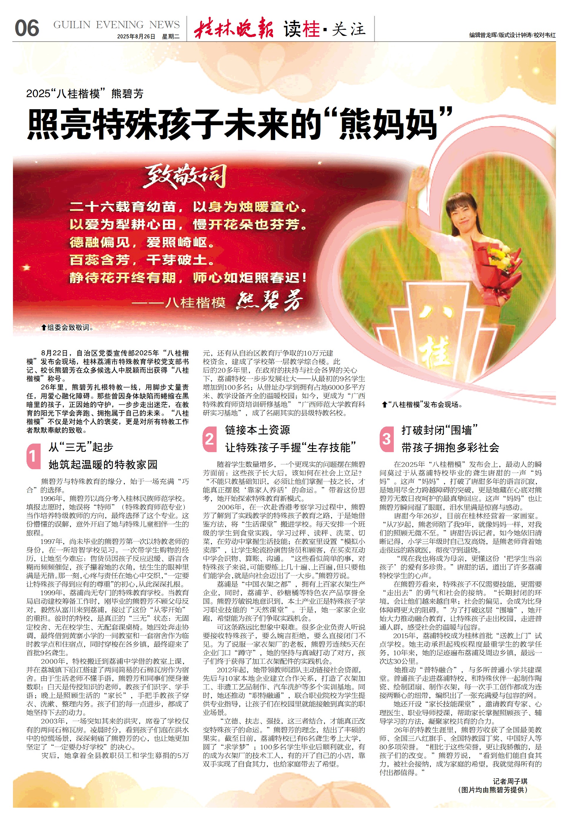 26年里,熊碧芳扎根特教一线,用脚步丈量责任,用爱心融化障碍。那些曾因身体缺陷而蜷缩在黑暗里的孩子,正因她的守护,一步步走出迷茫,在教育的阳光下学会奔跑、拥抱属于自己的未来。“八桂楷模”不仅是对她个人的褒奖,更是对所有特教工作者默默奉献的致敬。