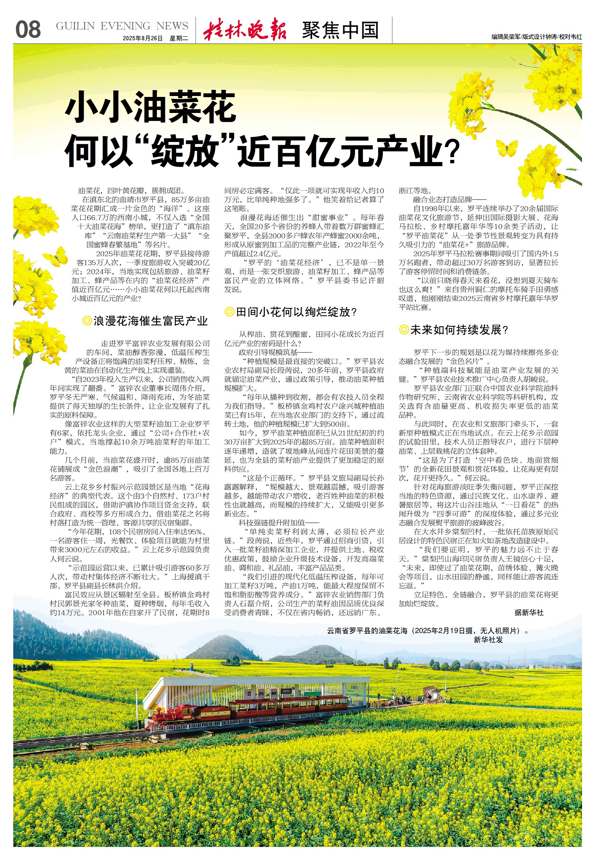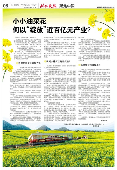 2025年油菜花花期,罗平县接待游客135万人次,一季度旅游收入突破20亿元;2024年,当地实现包括旅游、油菜籽加工、蜂产品等在内的“油菜花经济”产值近百亿元……小小油菜花何以托起西南小城近百亿元的产业?