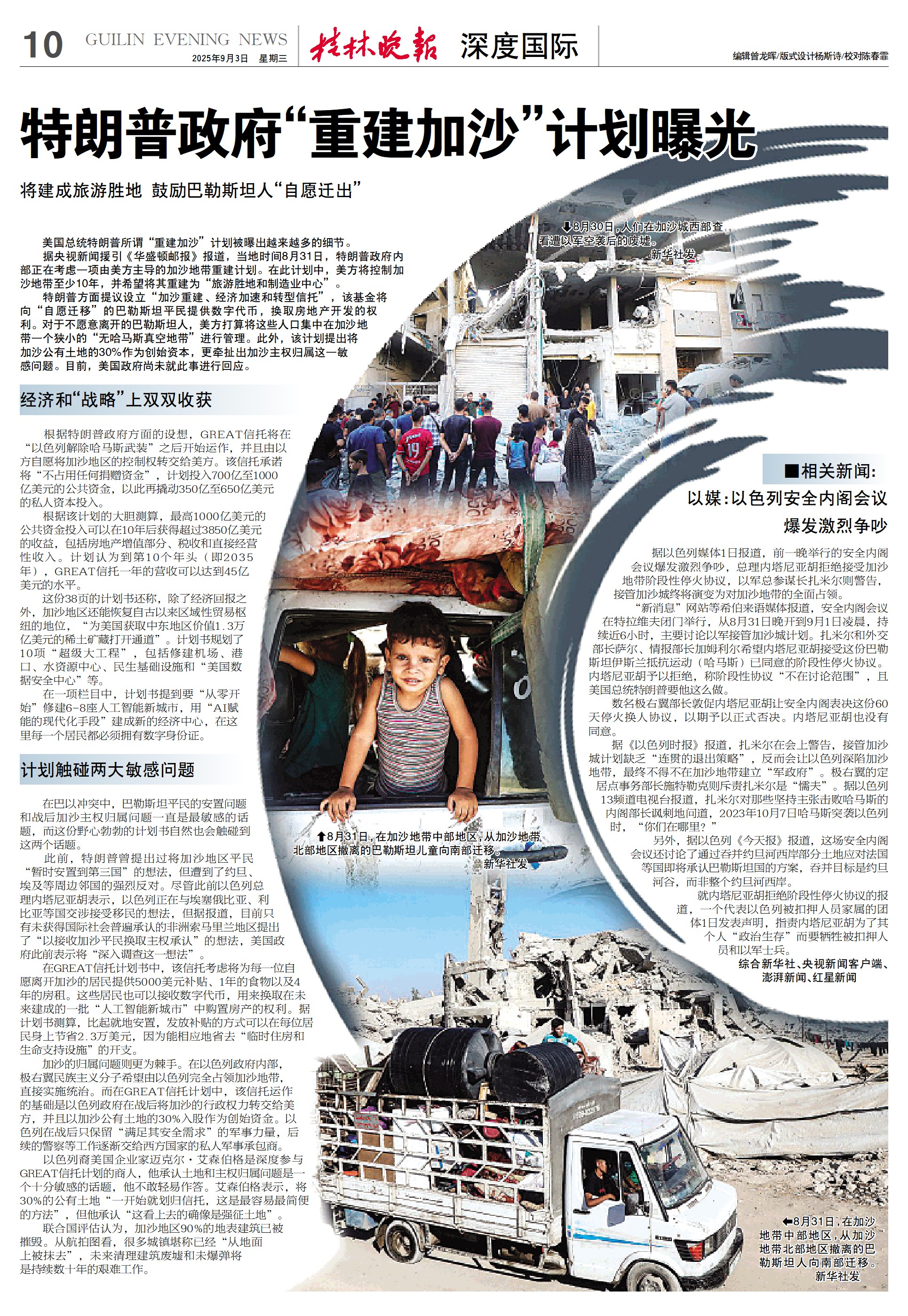 据央视新闻援引《华盛顿邮报》报道,当地时间8月31日,特朗普政府内部正在考虑一项由美方主导的加沙地带重建计划。在此计划中,美方将控制加沙地带至少10年,并希望将其重建为“旅游胜地和制造业中心”。