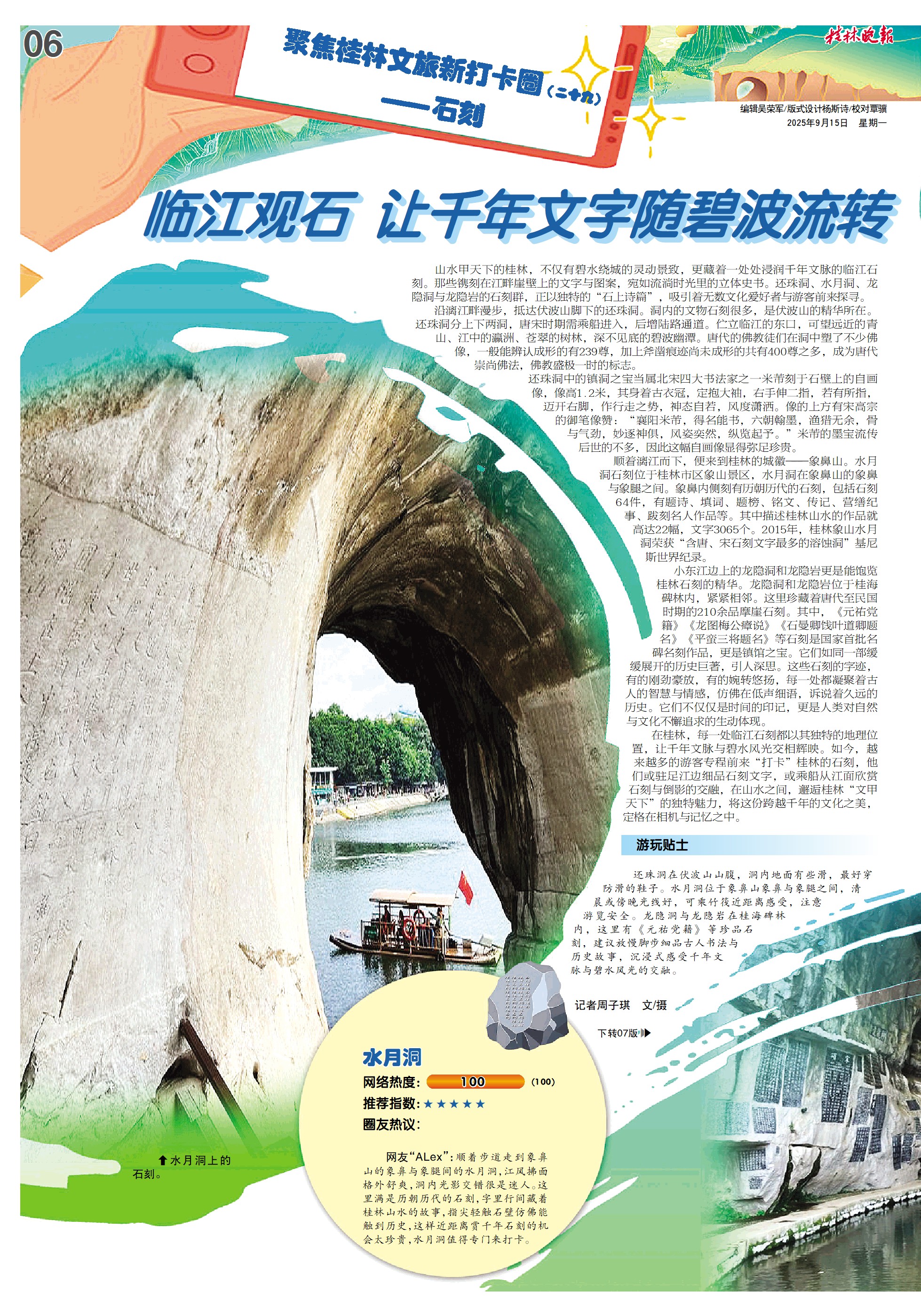 在桂林,每一处临江石刻都以其独特的地理位置,让千年文脉与碧水风光交相辉映。如今,越来越多的游客专程前来“打卡”桂林的石刻,他们或驻足江边细品石刻文字,或乘船从江面欣赏石刻与倒影的交融,在山水之间,邂逅桂林“文甲天下”的独特魅力,将这份跨越千年的文化之美,定格在相机与记忆之中。
