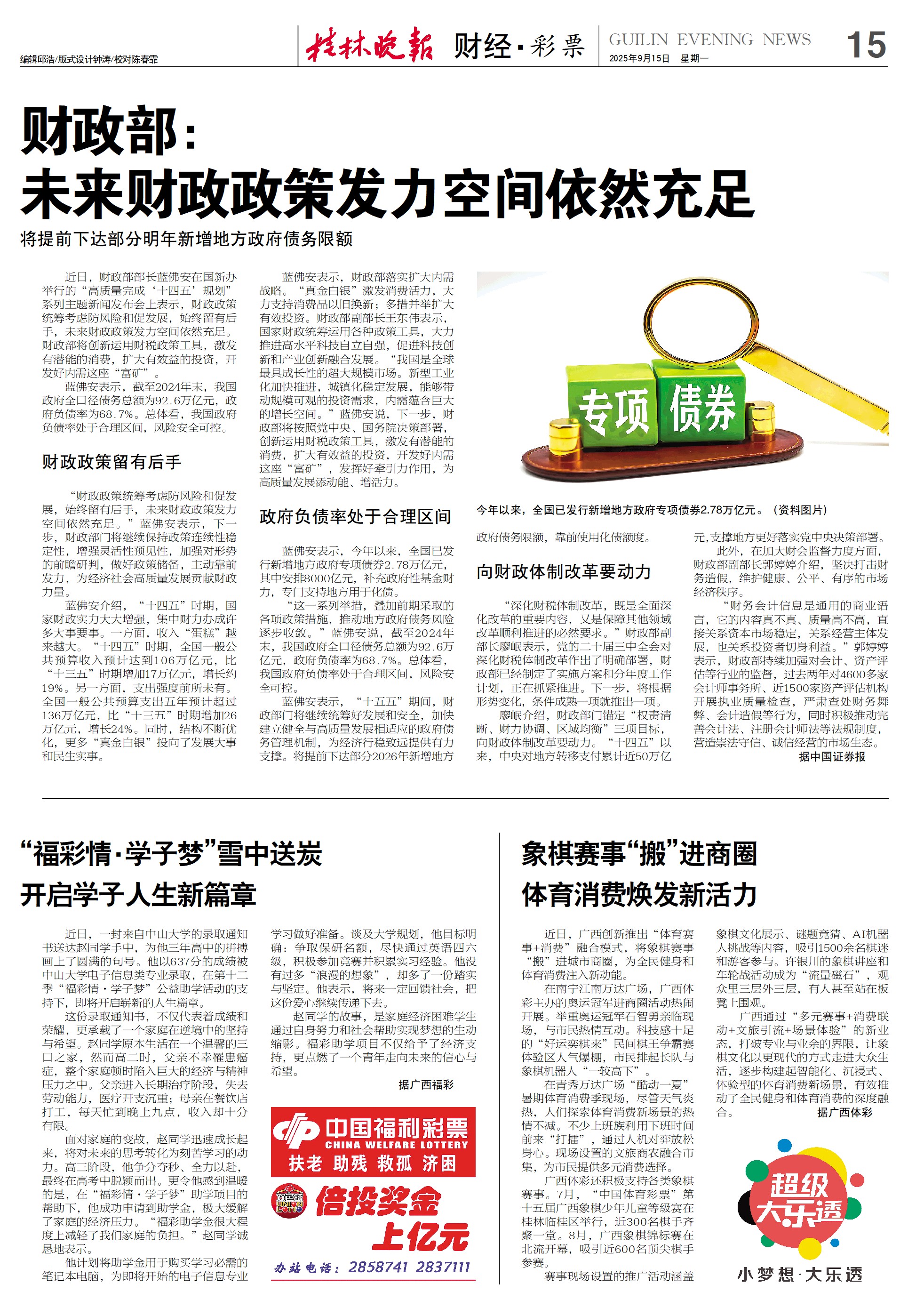 广西体彩还积极支持各类象棋赛事。7月,“中国体育彩票”第十五届广西象棋少年儿童等级赛在桂林临桂区举行,近300名棋手齐聚一堂。8月,广西象棋锦标赛在北流开幕,吸引近600名顶尖棋手参赛。