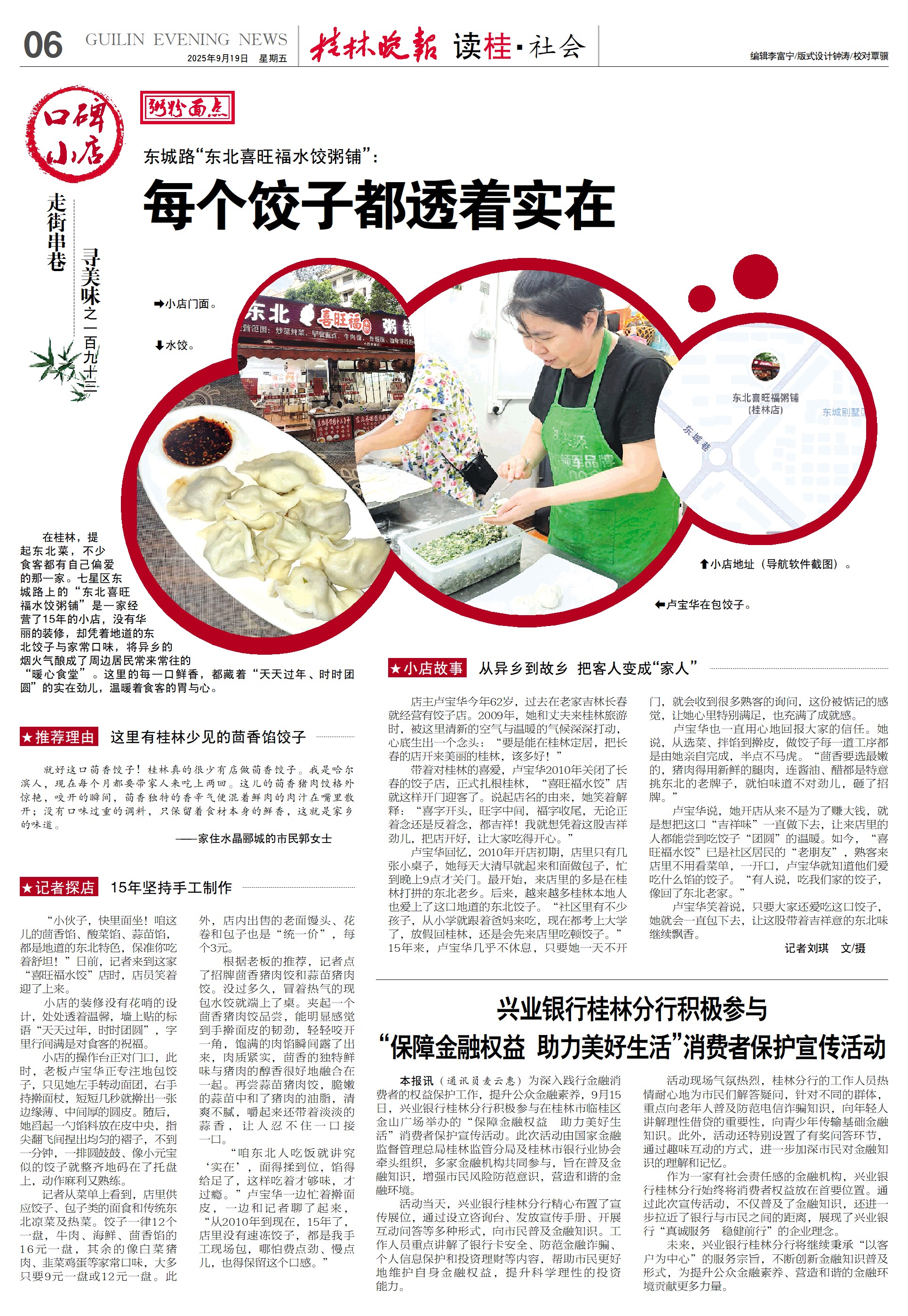 卢宝华回忆,2010年开店初期,店里只有几张小桌子,她每天大清早就起来和面做包子,忙到晚上9点才关门。最开始,来店里的多是在桂林打拼的东北老乡。后来,越来越多桂林本地人也爱上了这口地道的东北饺子。“社区里有不少孩子,从小学就跟着爸妈来吃,现在都考上大学了,放假回桂林,还是会先来店里吃顿饺子。”15年来,卢宝华几乎不休息,只要她一天不开门,就会收到很多熟客的询问,这份被惦记的感觉,让她心里特别满足,也充满了成就感。