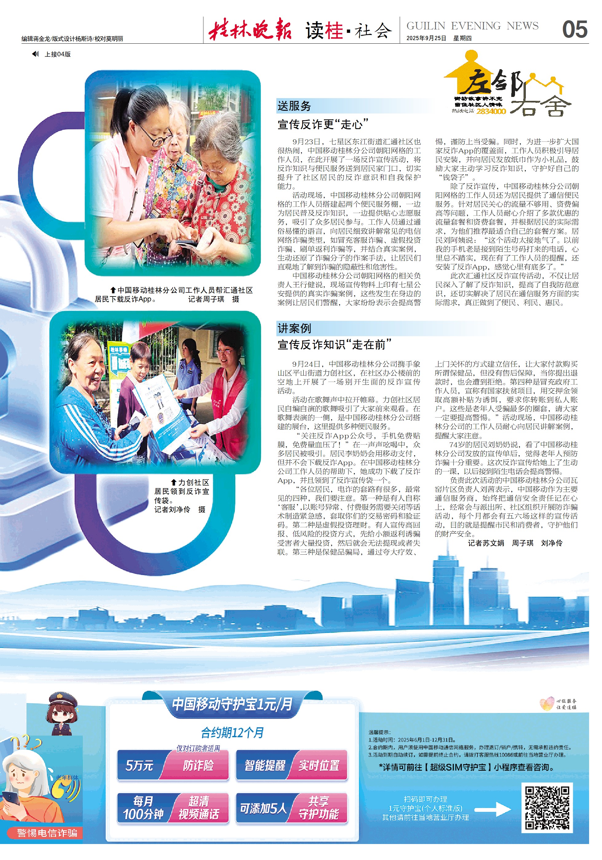 “各位居民,电诈的套路有很多,最常见的四种,我们要注意。第一种是有人自称‘客服’,以账号异常、付费服务需要关闭等话术制造紧急感,套取你们的交易密码和验证码。第二种是虚假投资理财。有人宣传高回报、低风险的投资方式,先给小额返利诱骗受害者大量投资,然后就会无法提现或者失联。第三种是保健品骗局,通过夸大疗效、上门关怀的方式建立信任,让大家付款购买所谓保健品,但没有售后保障,当你提出退款时,也会遭到拒绝。第四种是冒充政府工作人员,宣称有国家扶贫项目,用交押金领取高额补贴为诱饵,要求你转账到私人账户。这些是老年人受骗最多的圈套,请大家一定要提高警惕。”活动现场,中国移动桂林分公司的工作人员耐心向居民讲解案例,提醒大家注意。