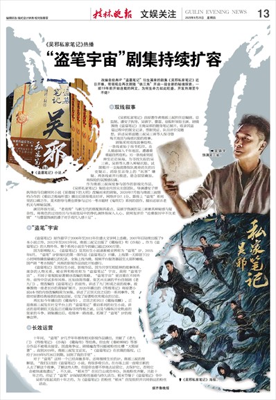 《盗墓笔记》及其衍生小说、影视作品,因为共享互相延伸的故事体系、庞杂的人物关系,被业界和粉丝称为“盗墓笔记”宇宙,简称“盗笔宇宙”。不同于常规按原著顺序改编的策略,“盗笔宇宙”更注重在不同外传、前传中尝试多样风格。比如由陈伟霆、张艺兴主演的平台自制剧《老九门》,便改编自《盗墓笔记》的前传,讲述了九门形成之前的故事,故事围绕一座老长沙的青铜矿展开。2020年播出的《终极笔记》将原著小说4本书的内容改编精简为36集,讲述了云顶天宫之后的一系列事件,凭借对原著经典场景的高度还原,引发了原著粉丝和观众的讨论。