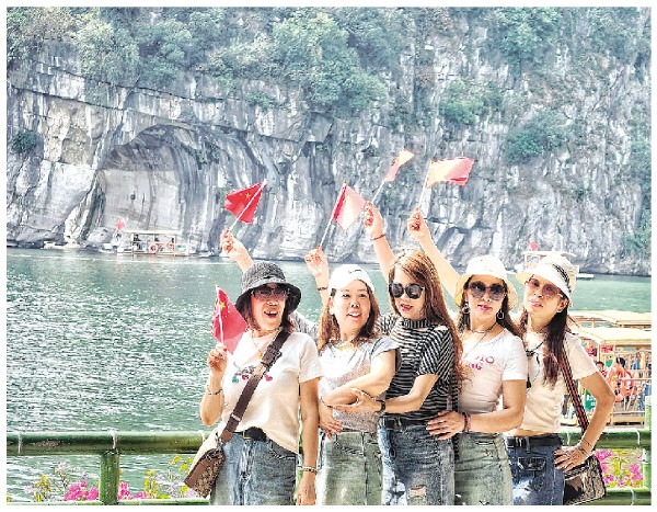 10月1日,在象山景区,几名游客正挥舞着国旗以象鼻山为背景拍照,她们在领略祖国大好河山的同时抒发着浓浓爱国情。记者滕嘉 摄