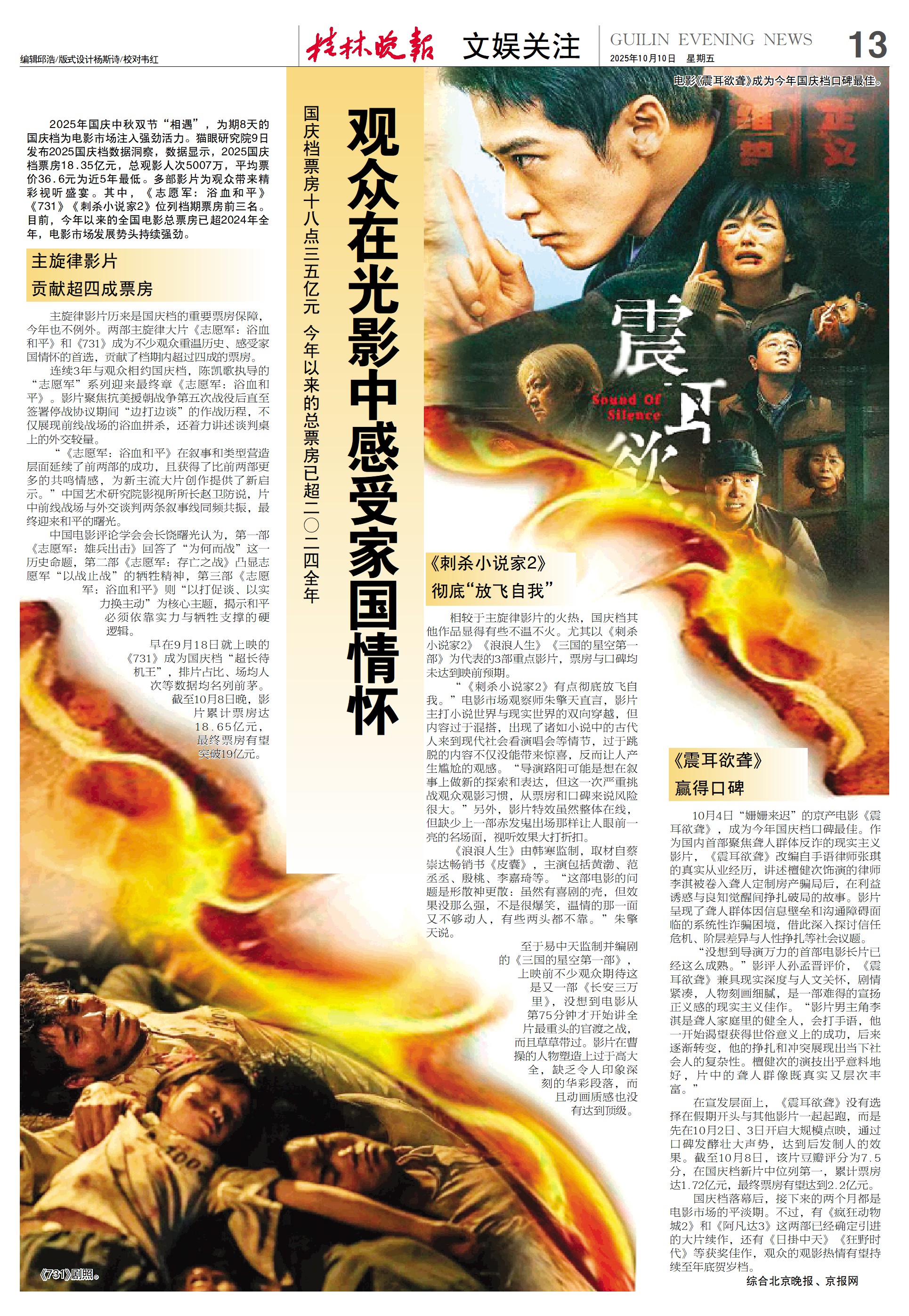 主旋律影片历来是国庆档的重要票房保障,今年也不例外。两部主旋律大片《志愿军:浴血和平》和《731》成为不少观众重温历史、感受家国情怀的首选,贡献了档期内超过四成的票房。