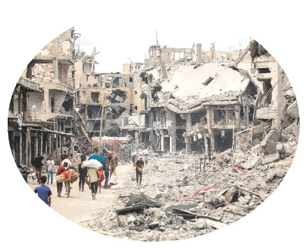 10月12日,在加沙地带南部汗尤尼斯,重返家园的巴勒斯坦人走过严重受损的建筑。新华社发